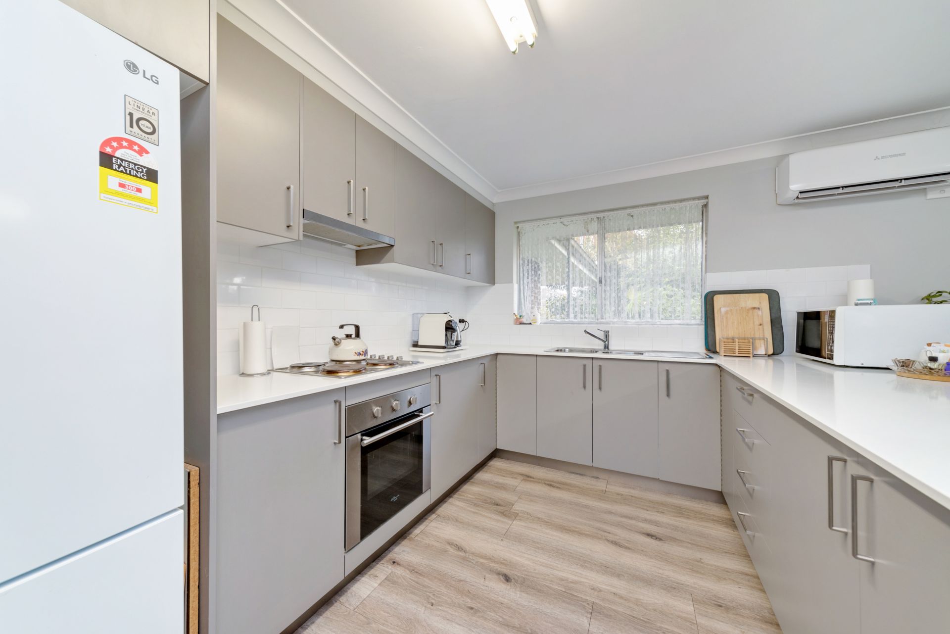 The modern kitchen features stainless steel appliances including an under-bench oven, cooktop, and rangehood, and opens to a spacious dining area with floating floors and lovely views of the backyard and beyond.