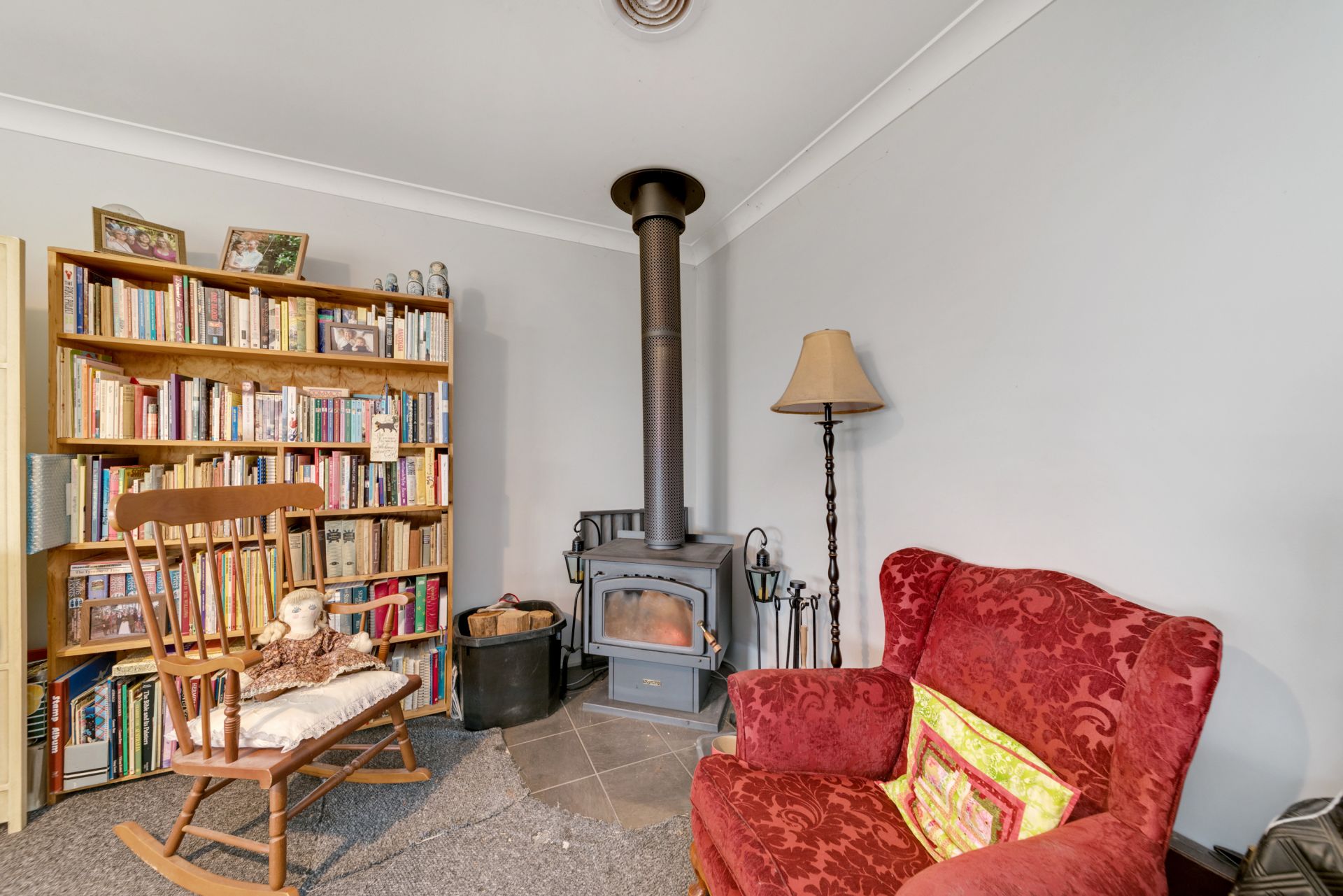 Generous lounge room provides a cosy atmosphere with slow-combustion wood heating, while reverse-cycle air conditioning and a vent from the wood heater in the hall and kitchen/ dining ensures year-round comfort.